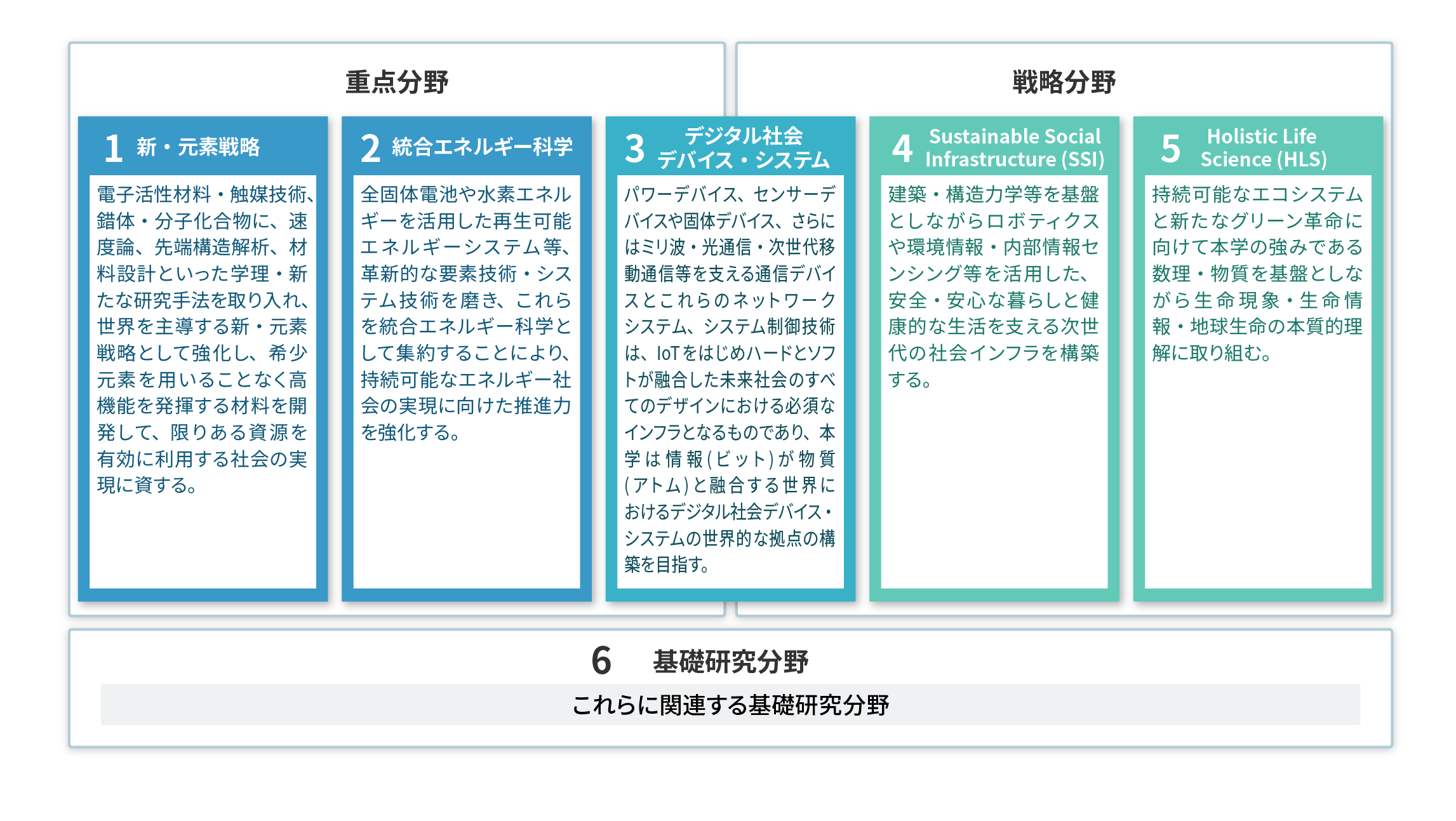 越境型理工系博士人材育成プロジェクトでは、本学が強みを有し、特に強化すべき研究教育分野として、以下の6つの分野を定めています。いずれも、我が国の課題解決等に大きく貢献しうる最先端の横断的専門領域です。申請時に、ご自身の研究内容に最も近いと思われる分野をひとつお選びいただきます。