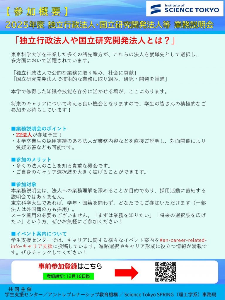 ※本イベントは、学生支援センター/アントレプレナーシップ教育機構 / Science Tokyo SPRING(理工学系)事務局の共同主催で実施いたします※